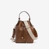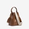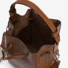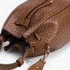 Bolso camel con textura entrelazada, asa ajustable y cierre de cordón. Diseño moderno y funcional.