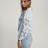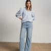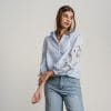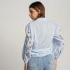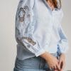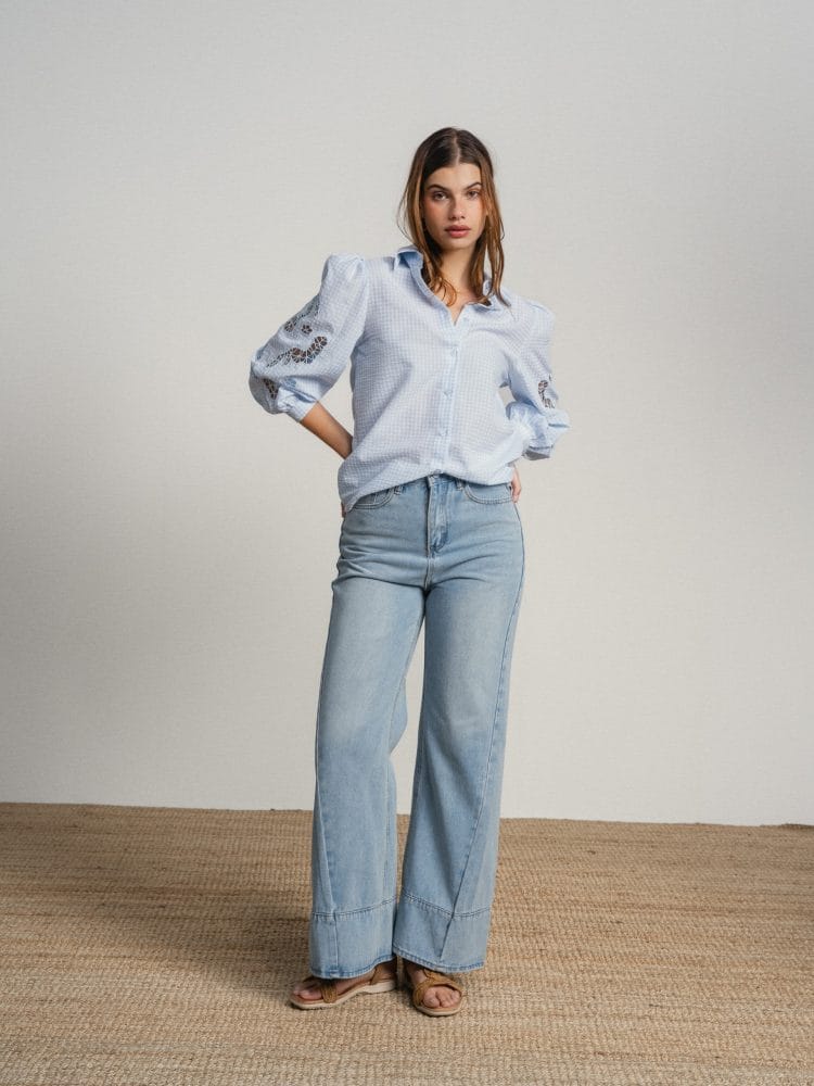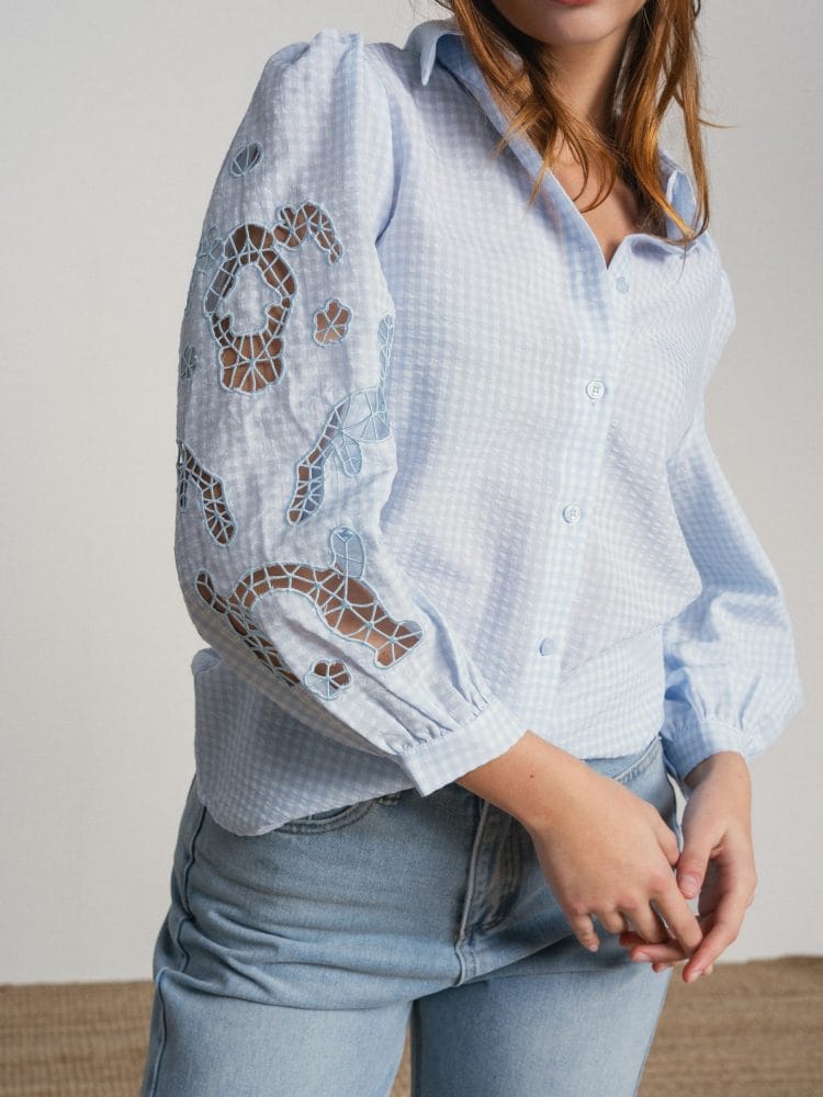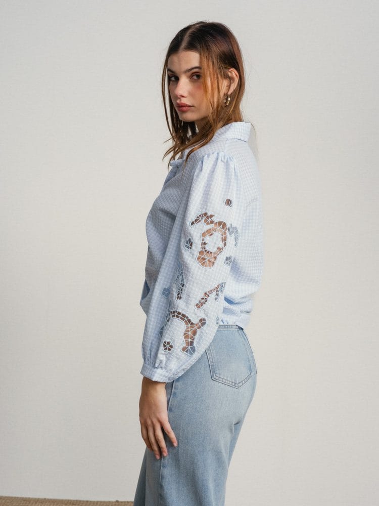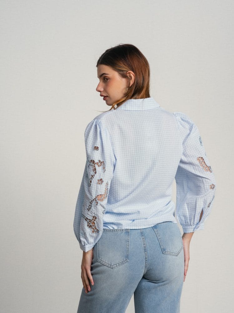 Camisa de manga larga azul claro con cuadritos blancos. Mangas abullonadas con bordado calado.