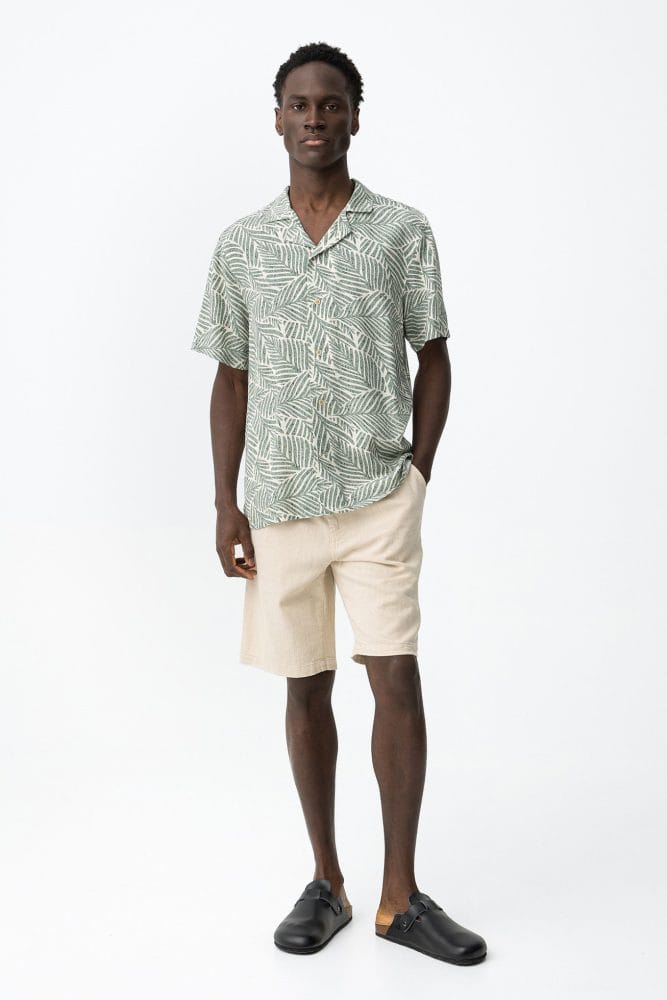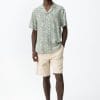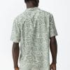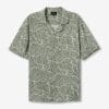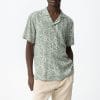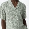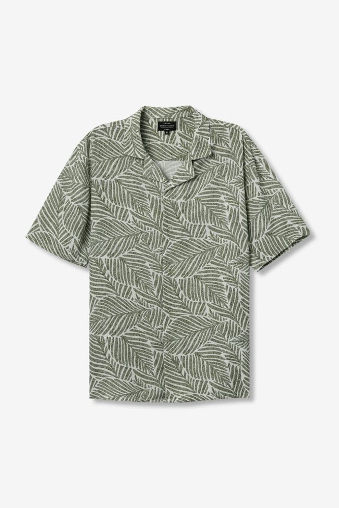 Camisa regular de manga corta, con estampado de hojas verde claro y botones delanteros visibles.