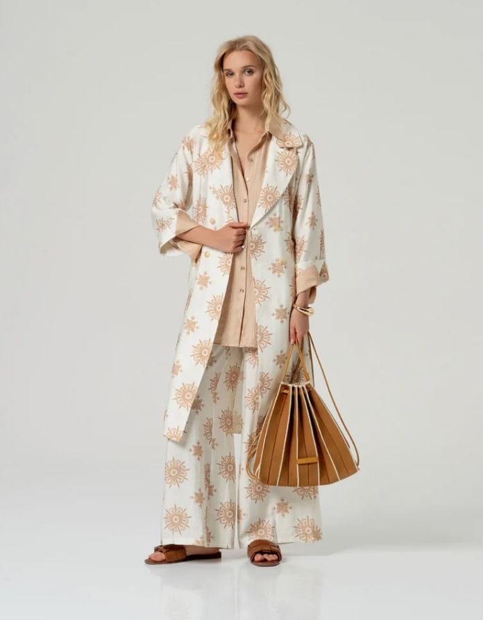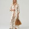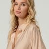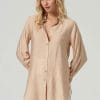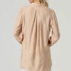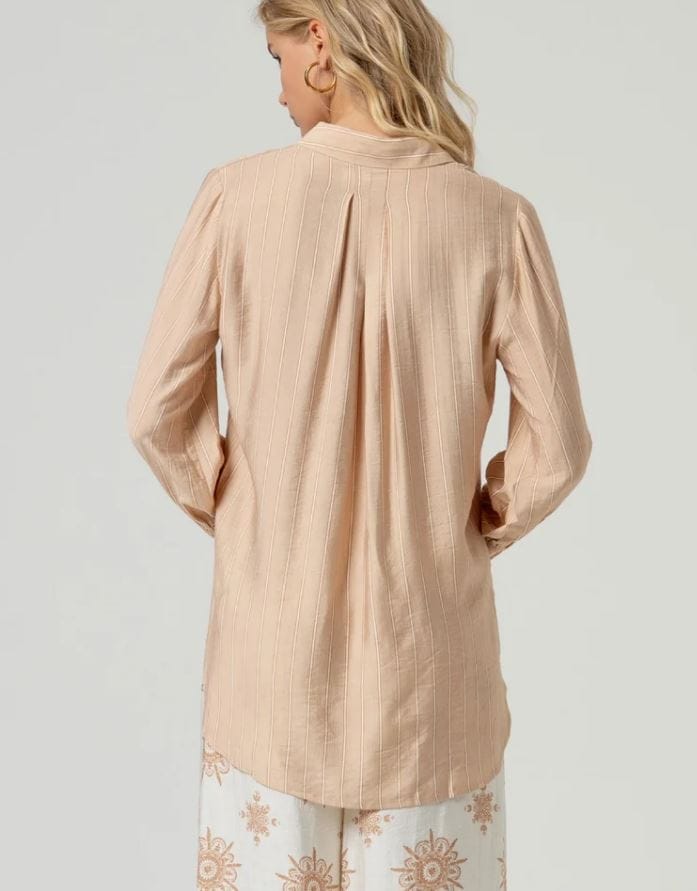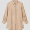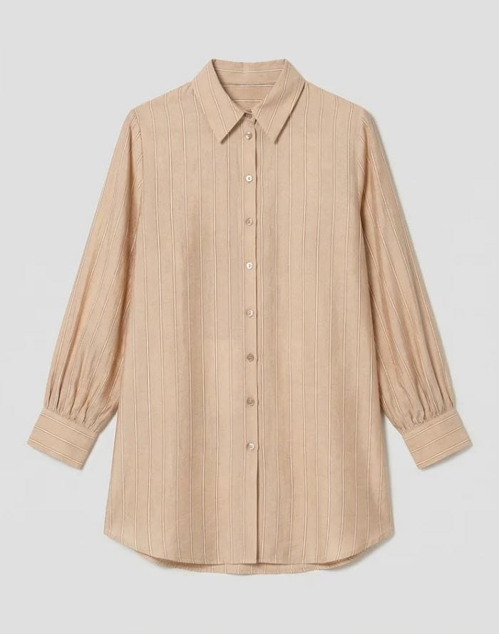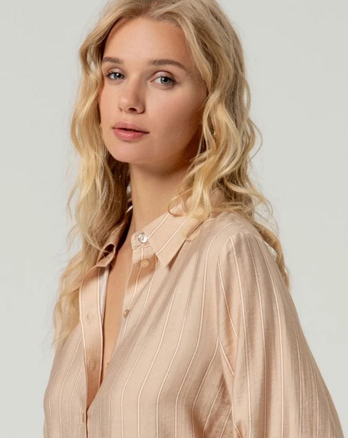 Camisa beige de manga larga con cuello camisero y cierre frontal de botones. Estampado de rayas. Corte recto y bajo ligeramente redondeado.
