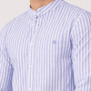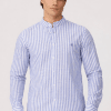 Camisa manga larga con cuello mao. Estampado de rayas verticales azules y blancas.