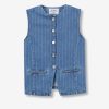 Chaleco de corte slim en azul medio, con rayas finas, botones metálicos y dos bolsillos delanteros.