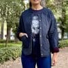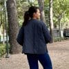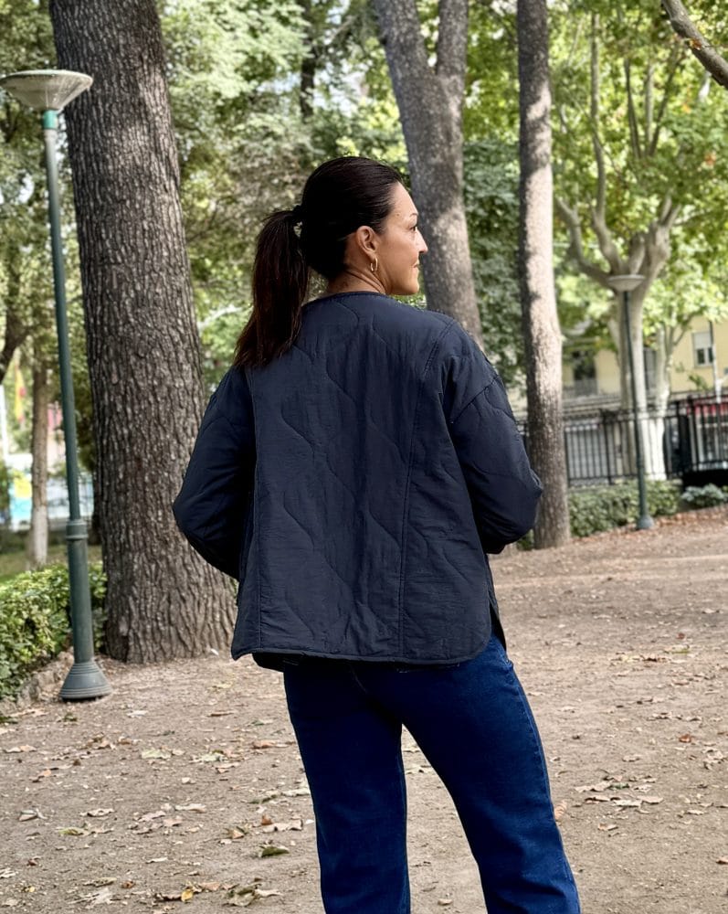 Chaqueta acolchada en color azul marino con diseño estampado de cuadros en puños. Cierre con botones, bolsillos plastrón.