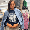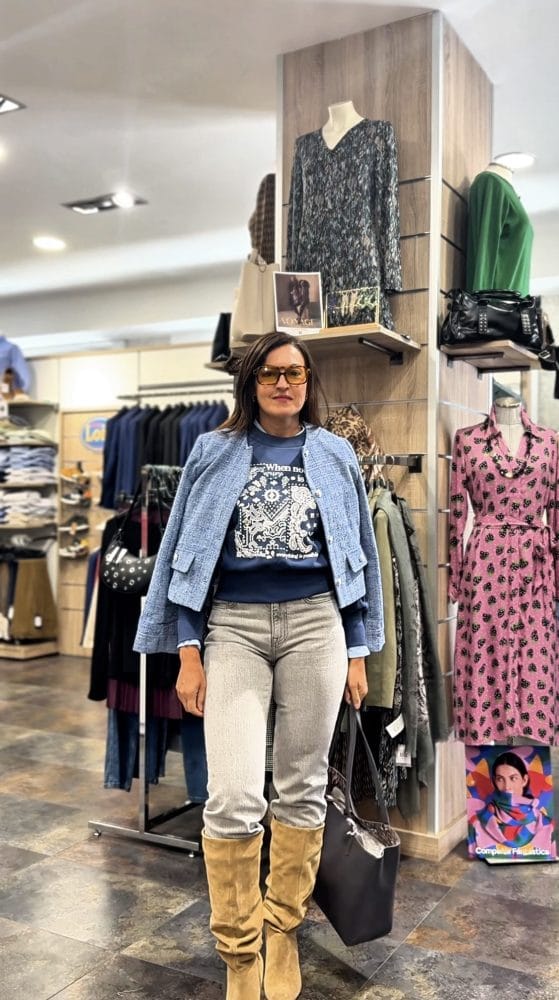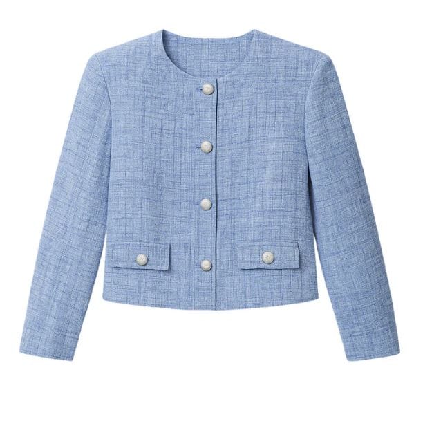 Chaqueta en tejido bouclé en azul cielo con botones plateados con emblema. Con hombreras ligeras y bolsillos plastrón.
