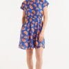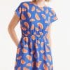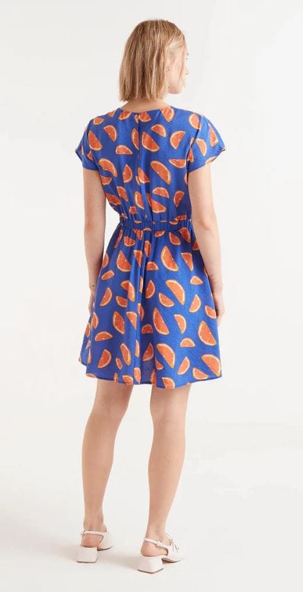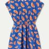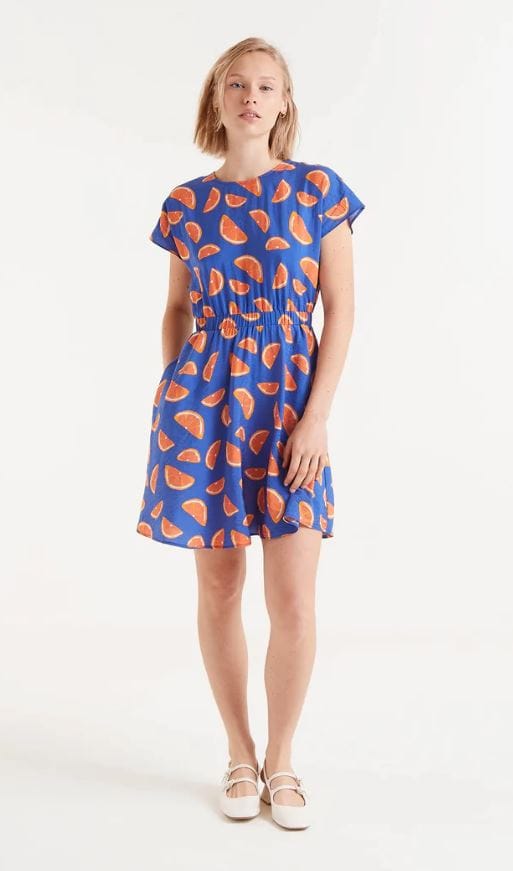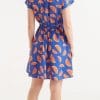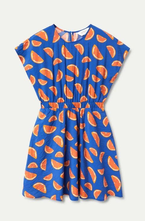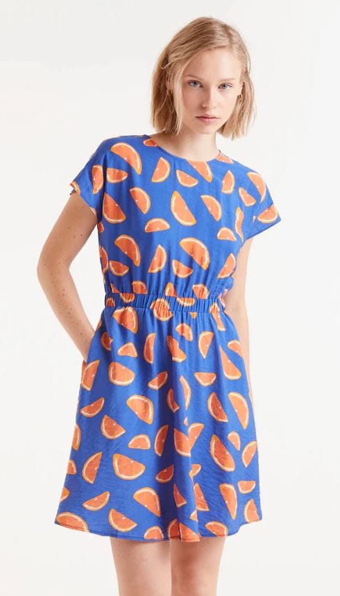 Vestido corto fluido con estampado de pomelos. Con cuello redondo y manga corta. Modelo entallado en la cintura con elástico.