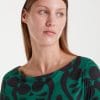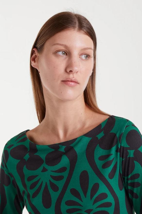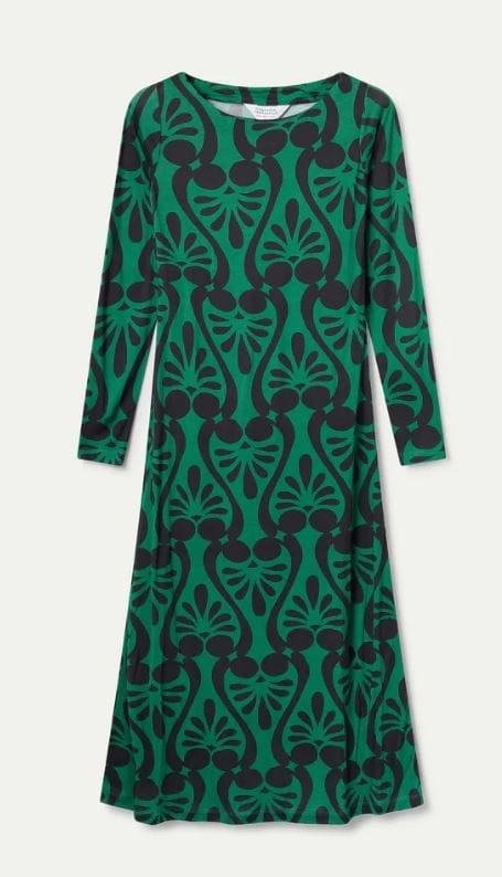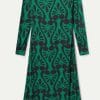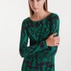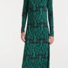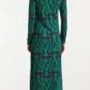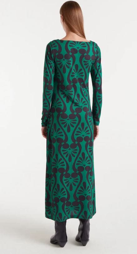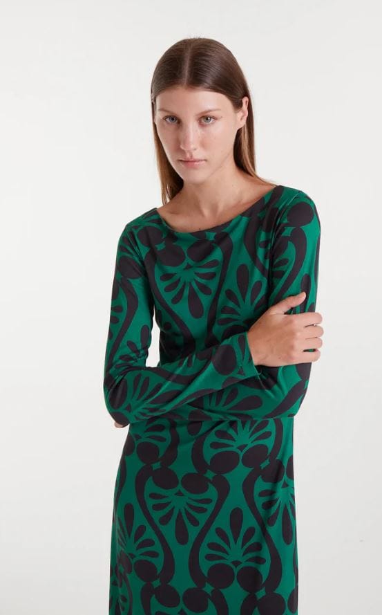 Vestido largo de color verde con estampado verde y negro. Con cuello barco y manga larga.