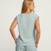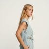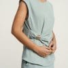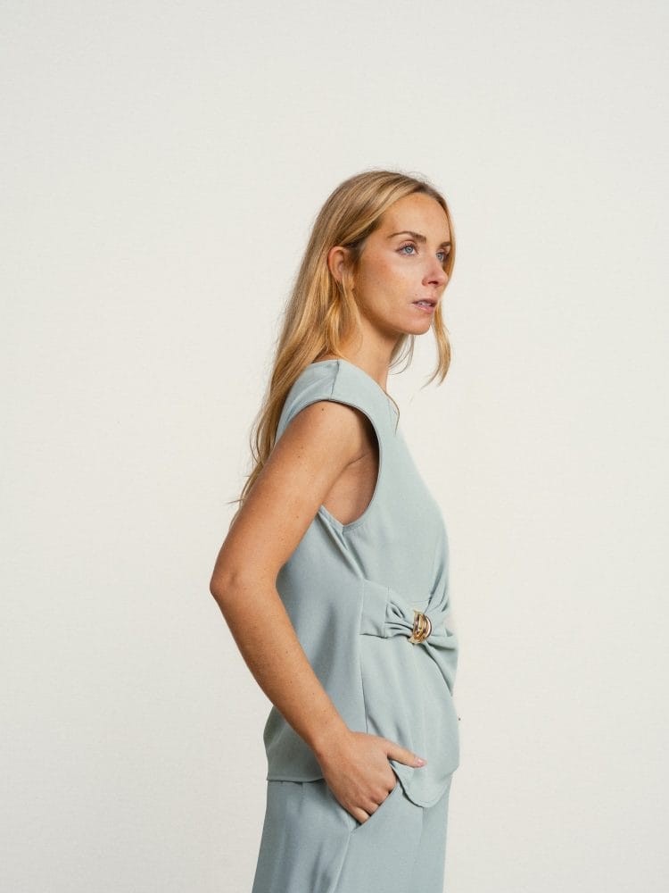 Blusa verde agua de tirantes con detalle dorado en la cintura.