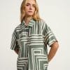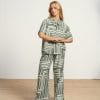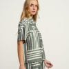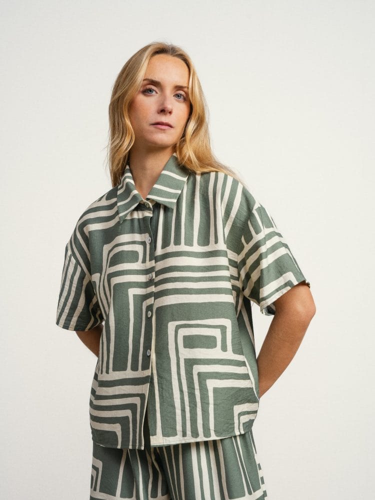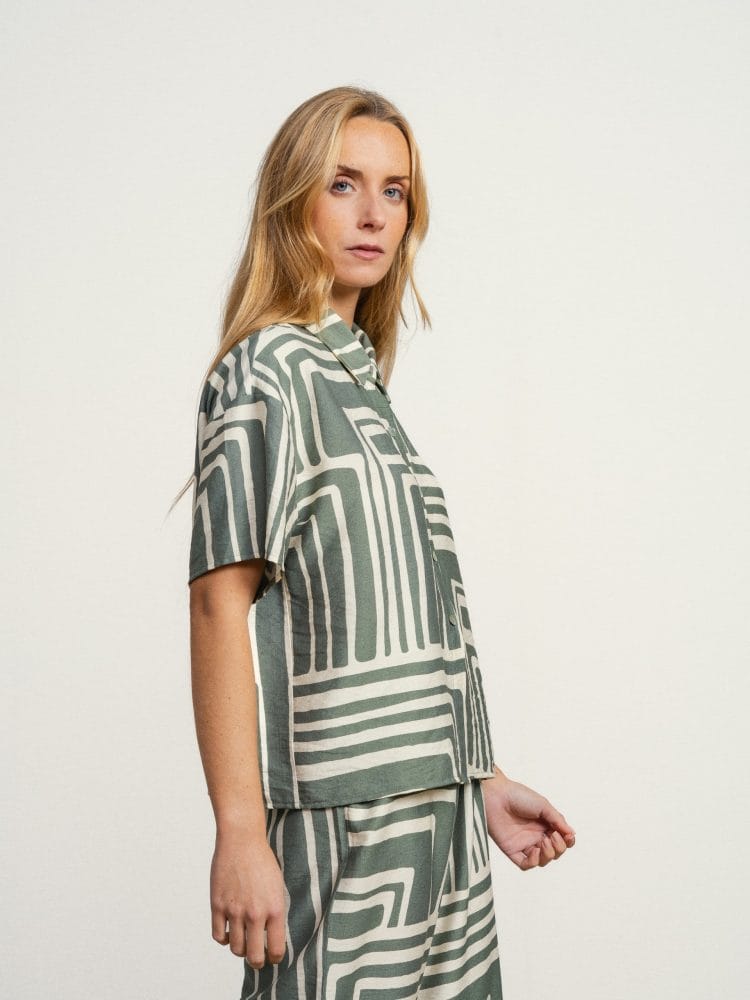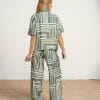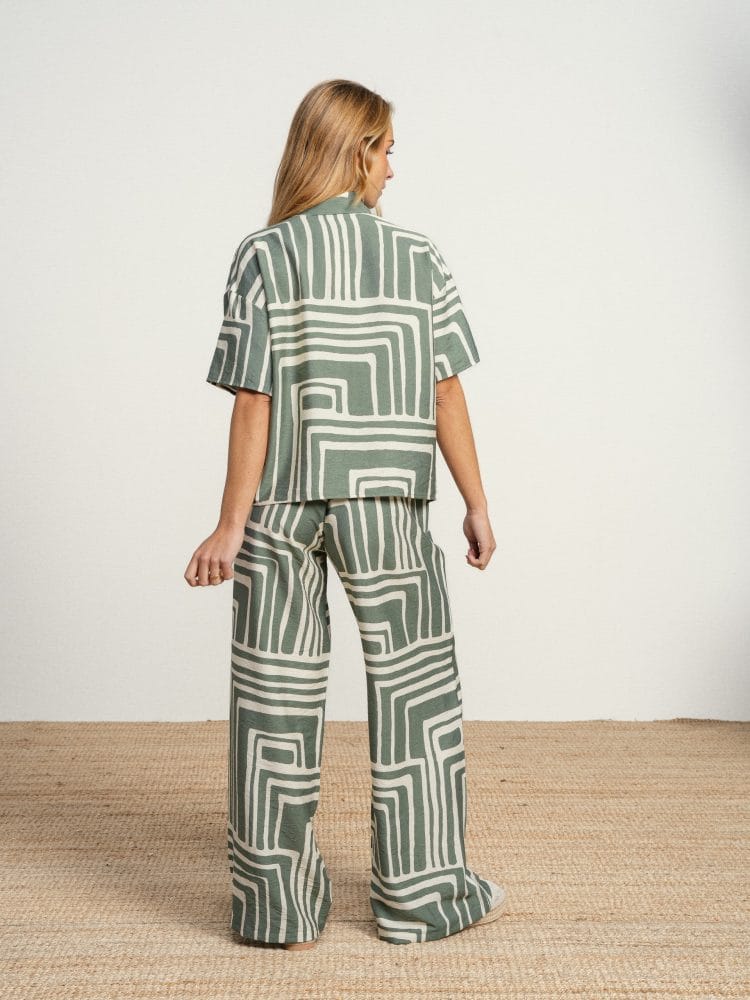 Conjunto de camisa y pantalón fuido. Estampado geométrico verde y blanco.