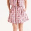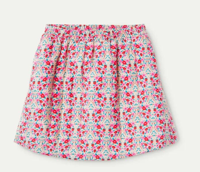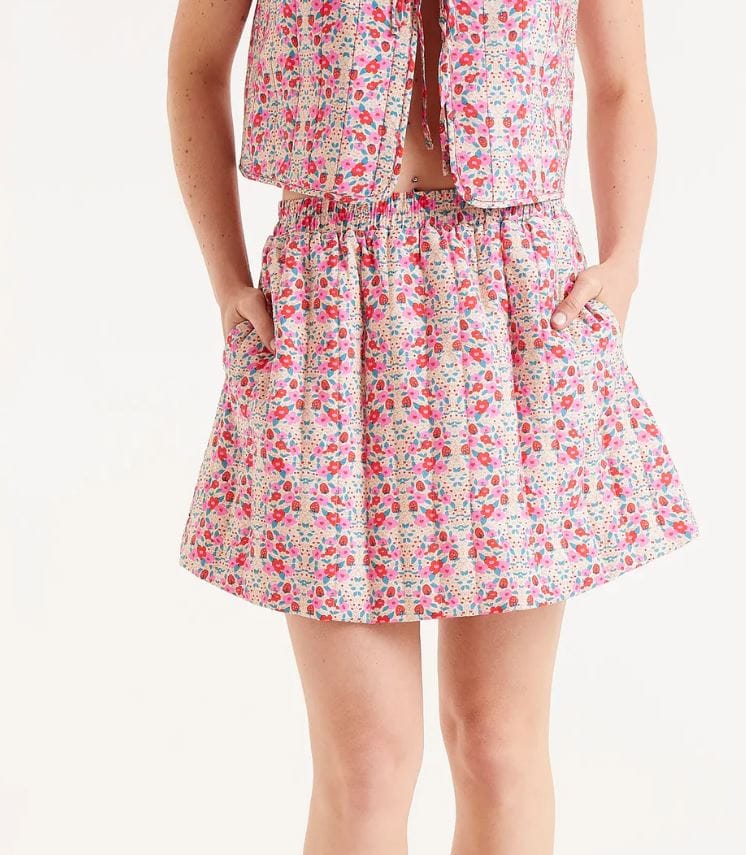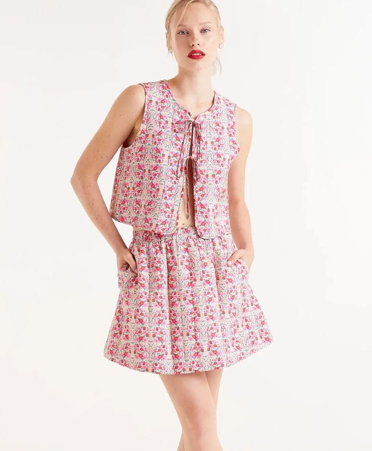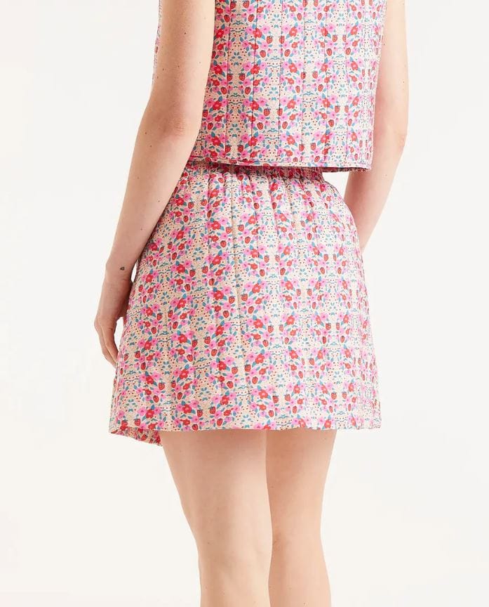 Falda corta acolchada con estampado floral y fresas. Cintura elástica de tiro medio. Bolsillos laterales.