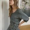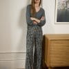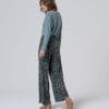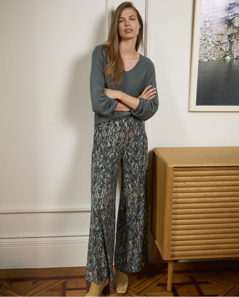 Pantalón estampado azul petróleo oversize amplio con cintura elástica, sin cremalleras ni botones.