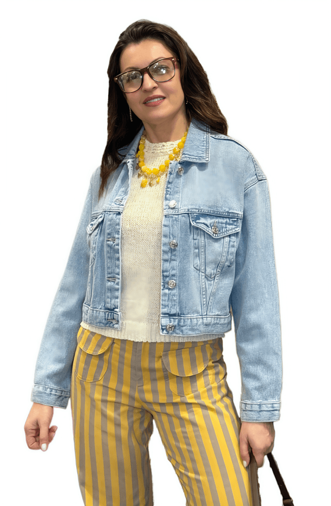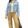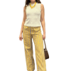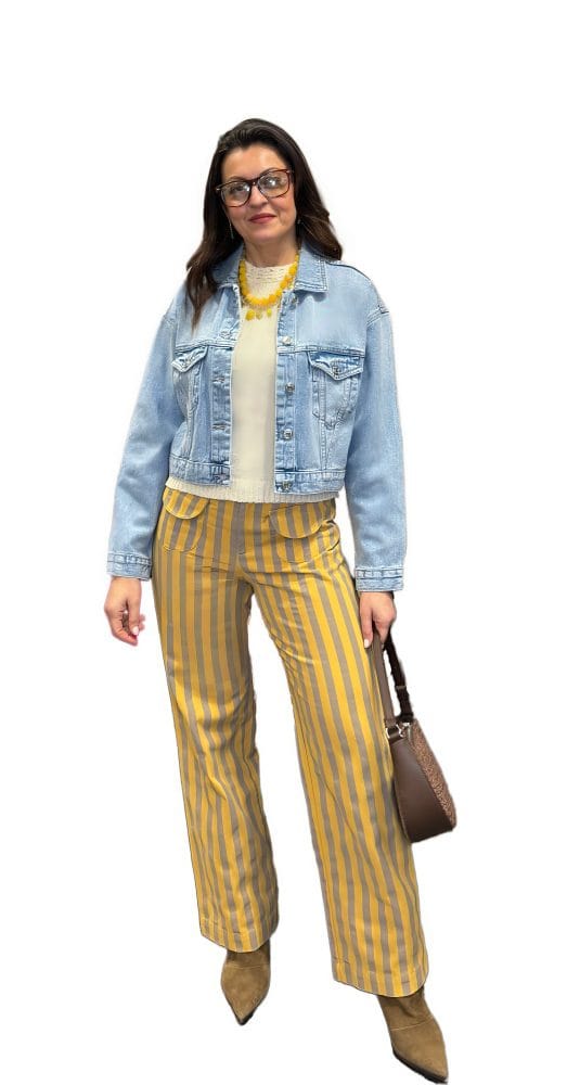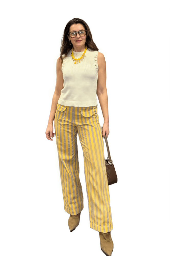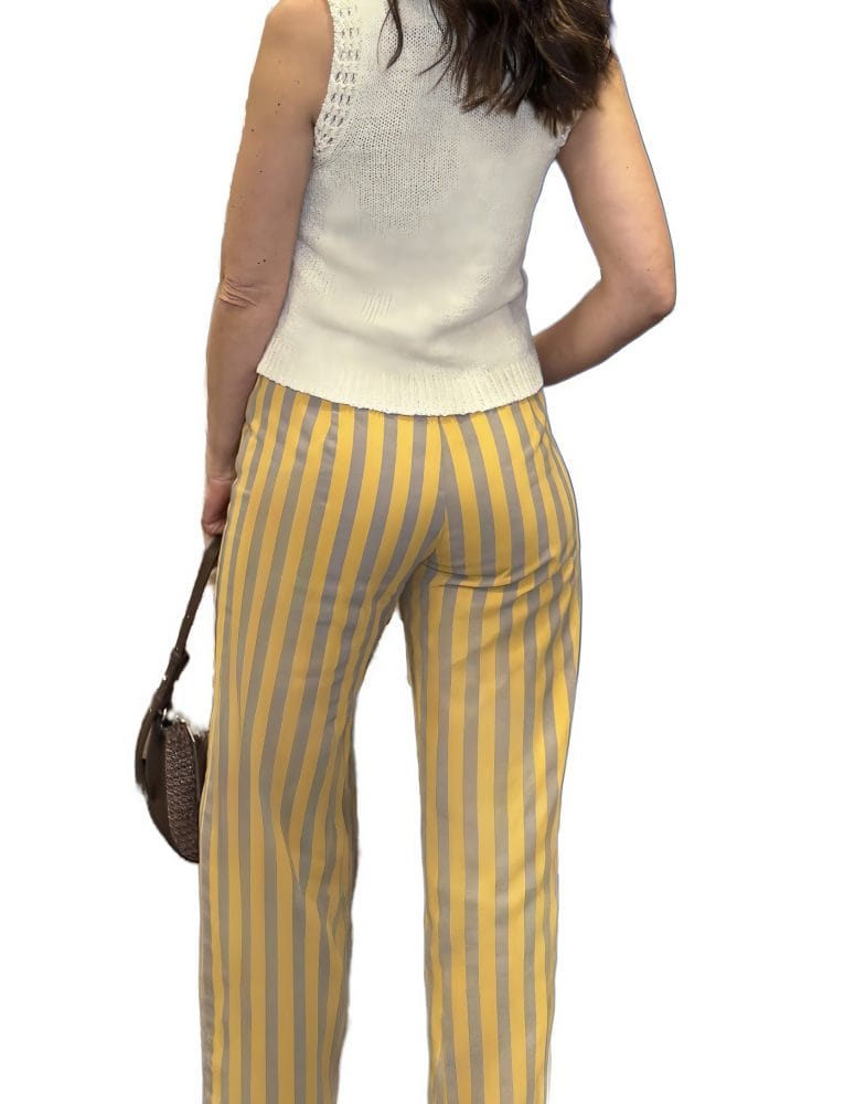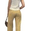 Pantalón pierna ancha con estampado de rayas verticales amarillas y marrones. Dos bolsillos plastón.