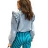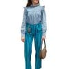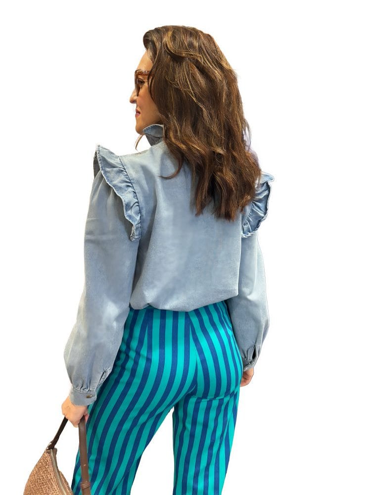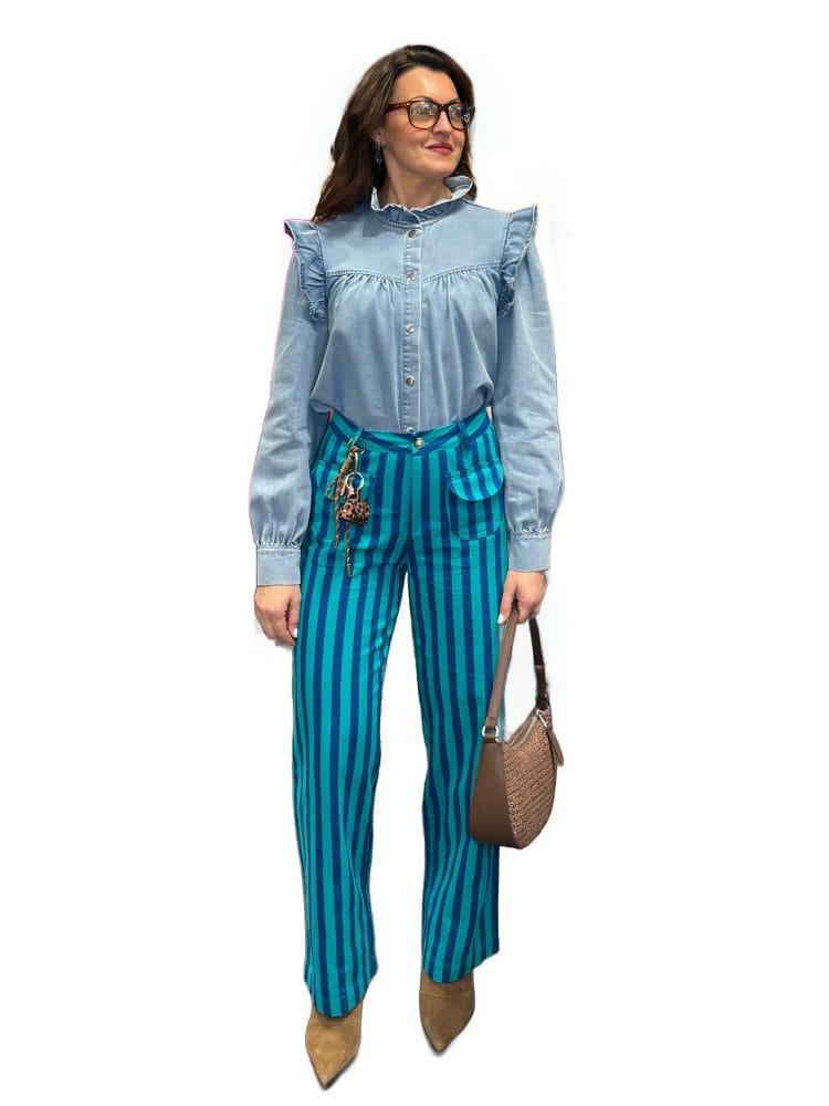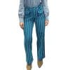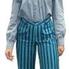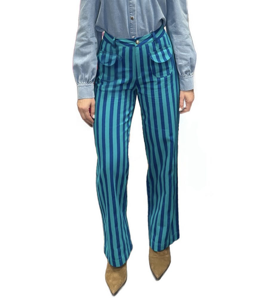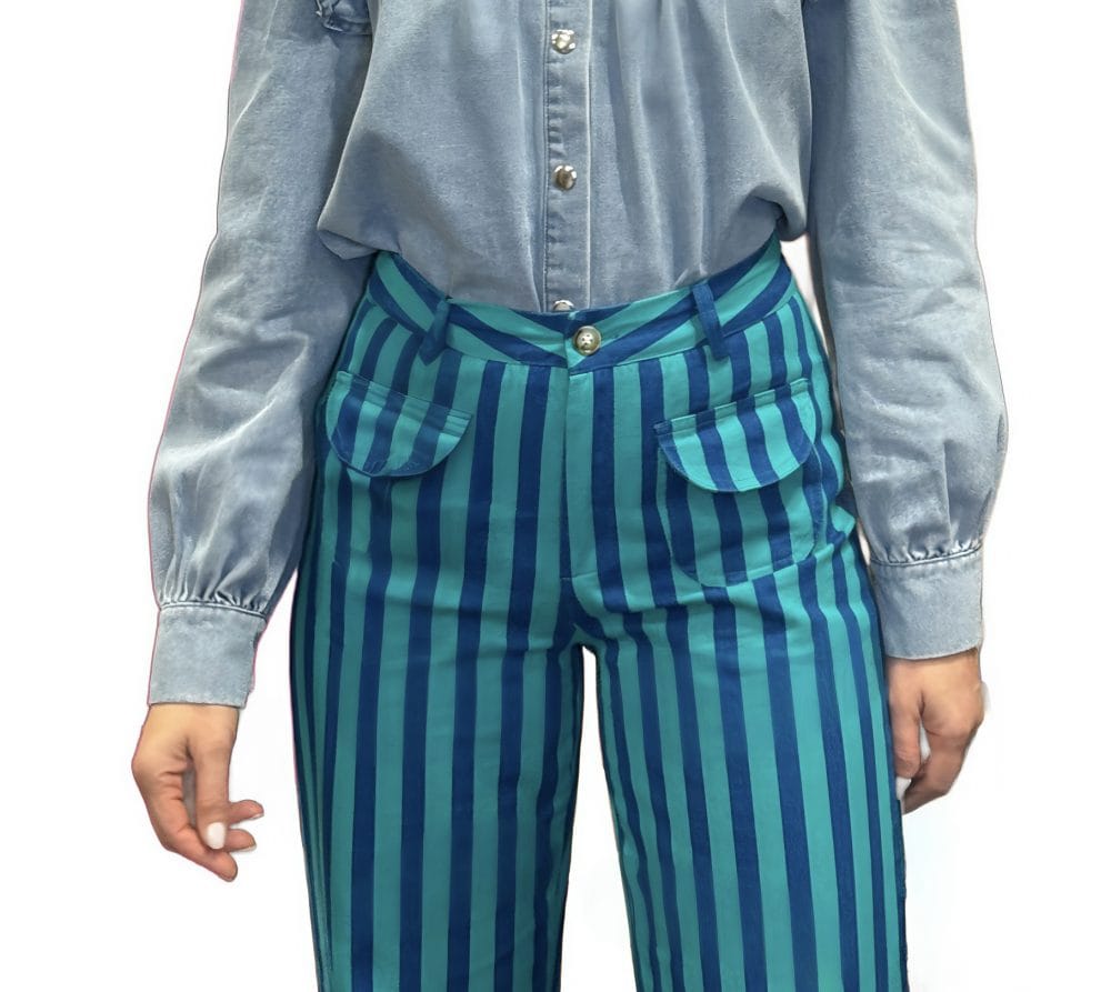Pantalón pierna ancha con estampado de rayas verticales verdes y azules. Dos bolsillos plastón.