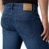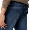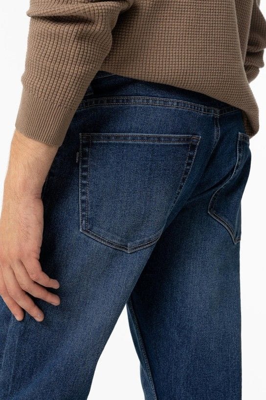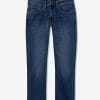 Pantalones vaqueros rectos con cinco bolsillos. Cierre frontal con cremallera y botón metálico.