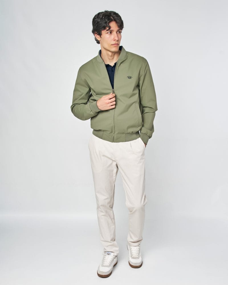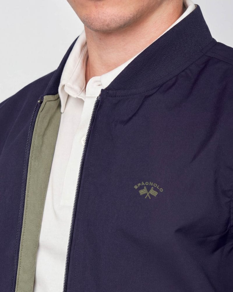 Cazadora de hombre reversible de Spagnolo. Color azul marino y verde kaki. Cierre con cremallera, cuello alto y logotipo bordado en el pecho.