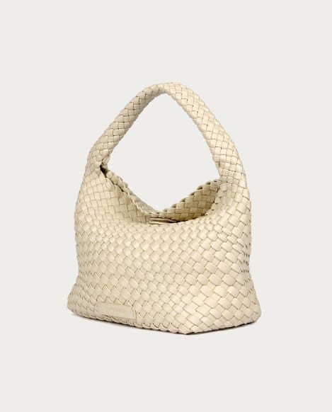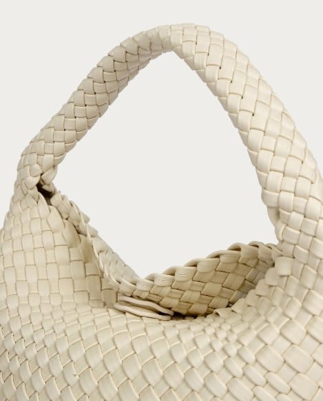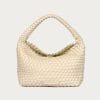 Bolso beige compacto de diseño trenzado, con compartimento principal con cierre magnético tipo clic y asa para llevar al hombro.