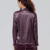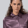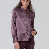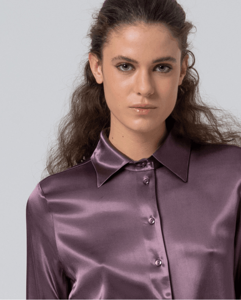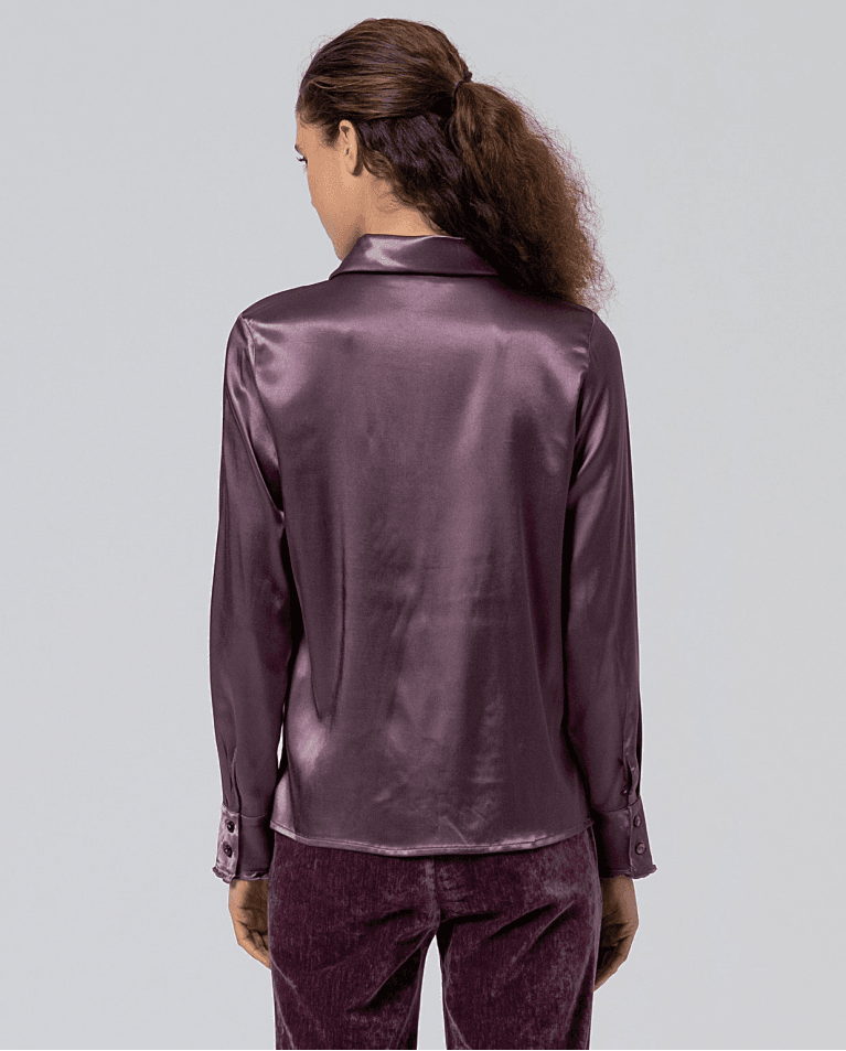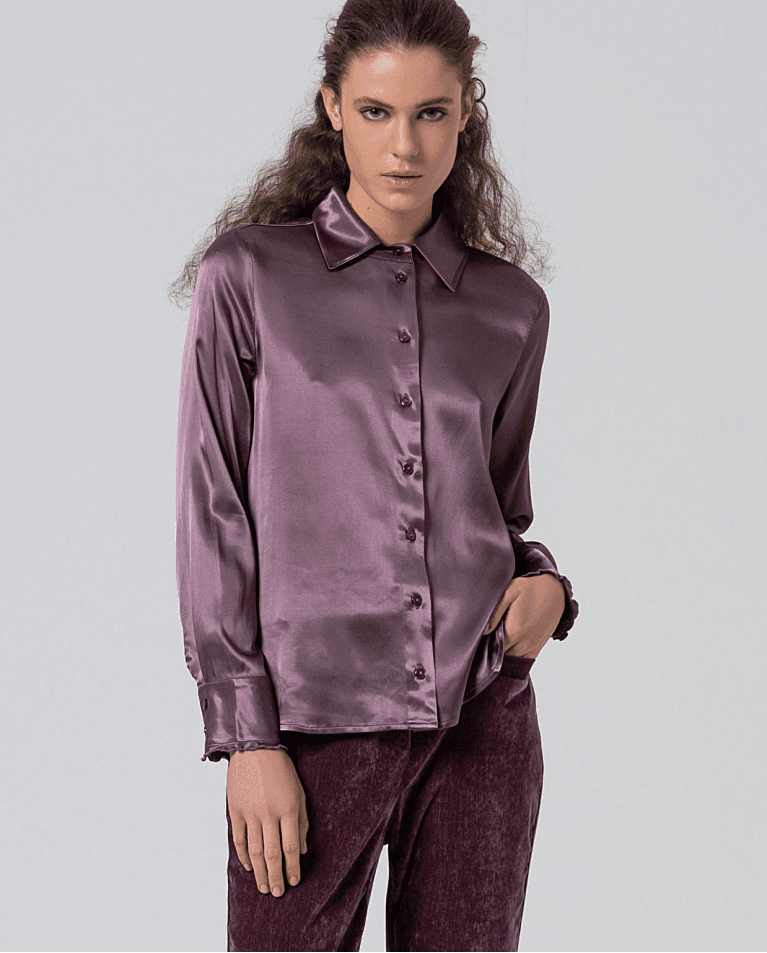 Camisa satinada con tacto suave. Cuello y puños rematados con volantes.