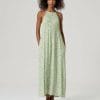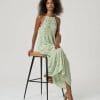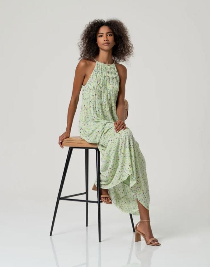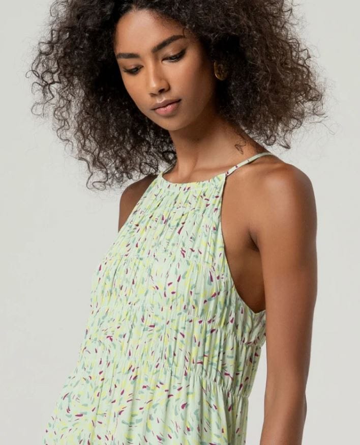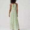Vestido largo estampado con tirantes finos y escote redondo con fruncido. Presenta corte amplio con caída recta y largo maxi.