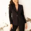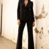 Traje chaqueta azul marino con estampado de raya diplomática. Pantalón acampanado.