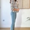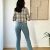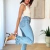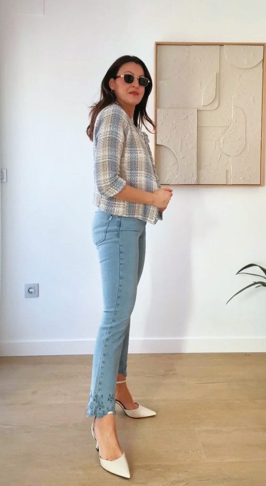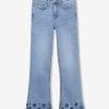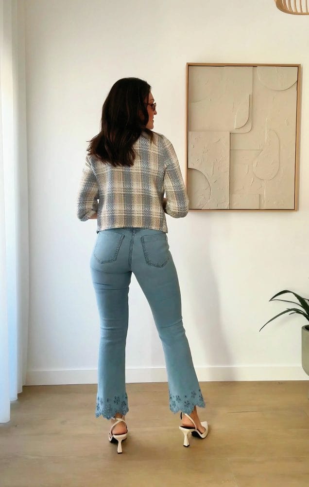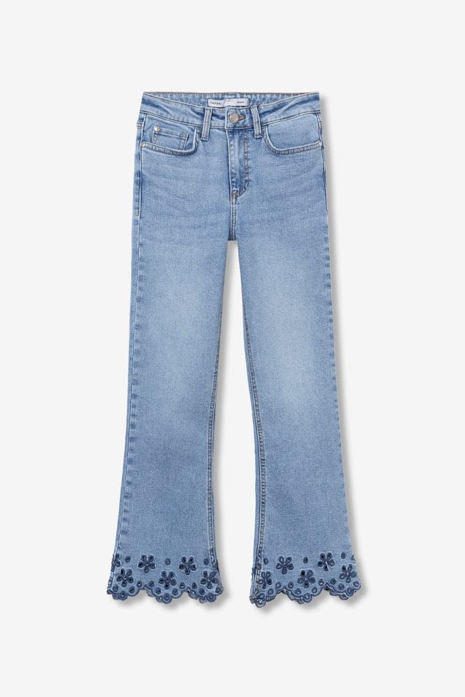 Vaqueros de corte cropped flare en azul claro con calado floral en el bajo.