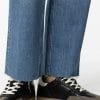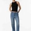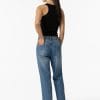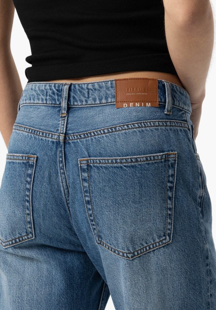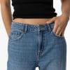 Vaqueros de tiro alto y pernera recta y cinco bolsillos. Cierre frontal con cremallera y botón metálico. Bajo acabado desflecado.