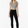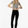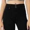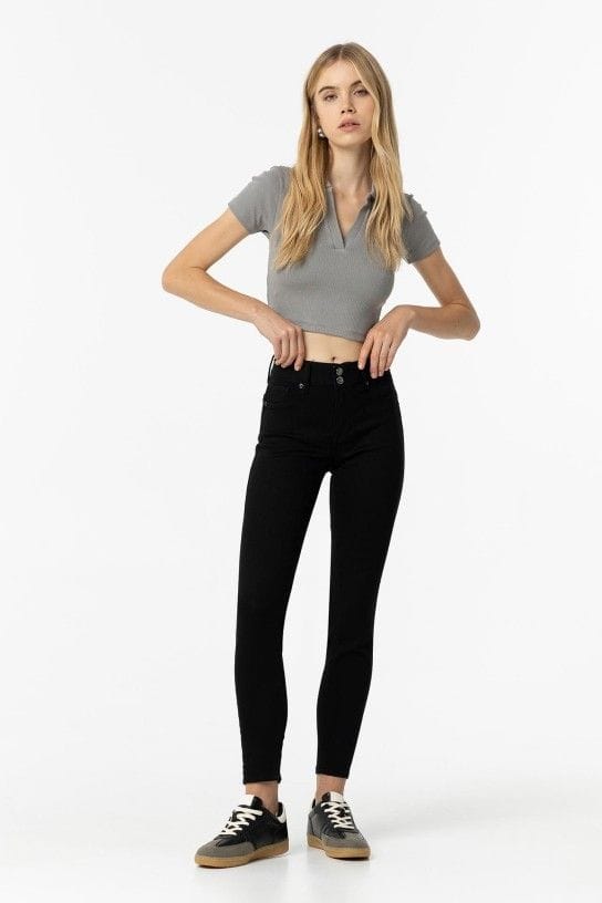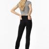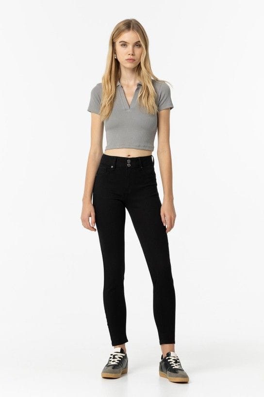 Jeans ajustados negros de tiro medio con tres bolsillos. Efecto push-up. Cierre frontal con cremallera y botones metálicos. Bolsillos falsos delanteros.