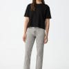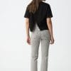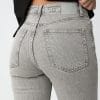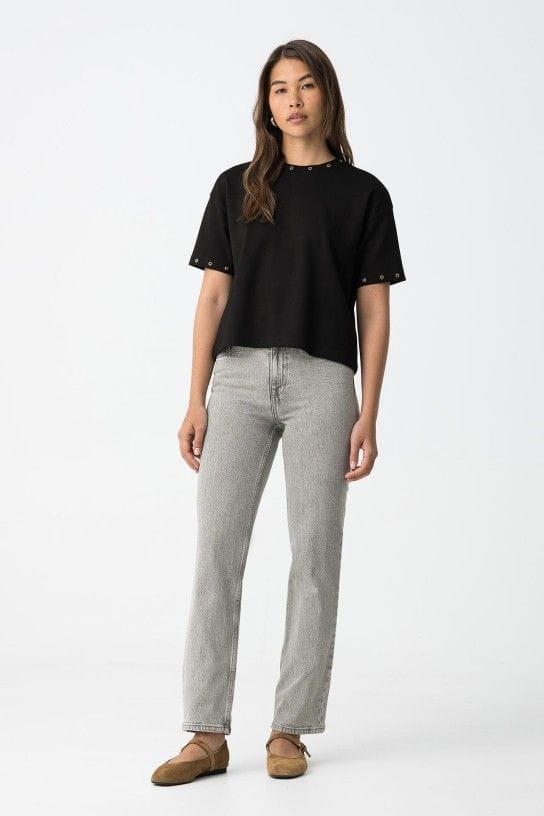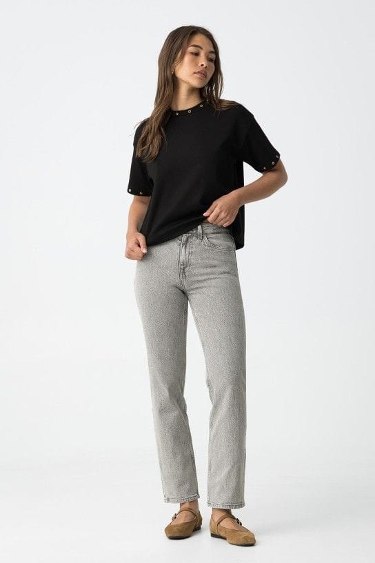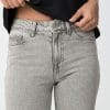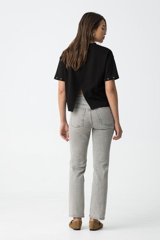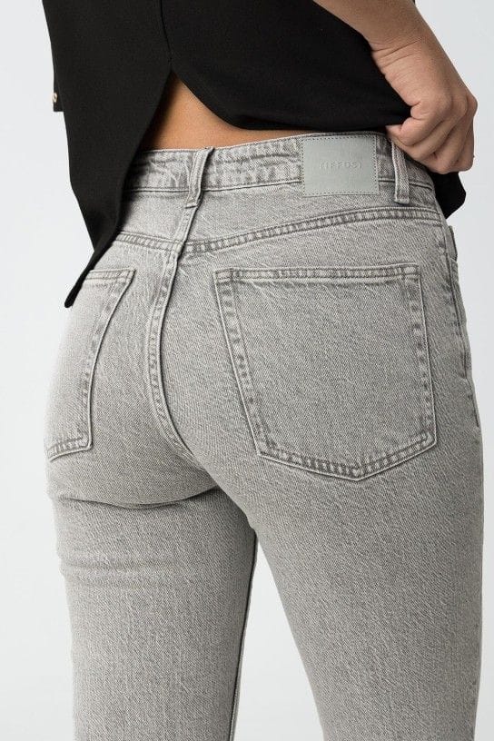 Vaqueros de cintura alta en gris claro, corte recto y cinco bolsillos. Cierre con cremallera y botón metálico.