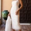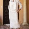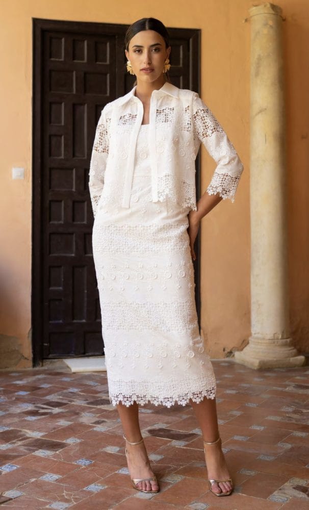 Vestido “Mamá de Comunión” midi, bordado calado blanco con chaqueta. Con tirantes, cremallera en la espalda, puntillas en el bajo, con hombreras, forro y chaqueta abotonada.