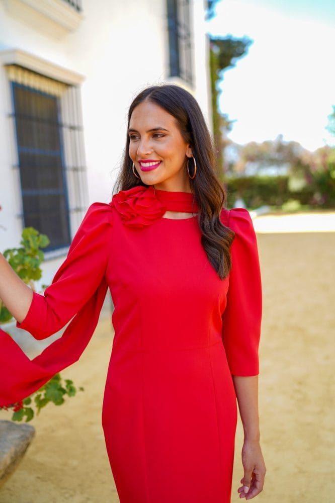Vestido midi recto liso rojo. Con fular con flor desmontable. Manga tres cuartos.