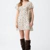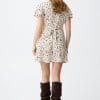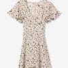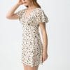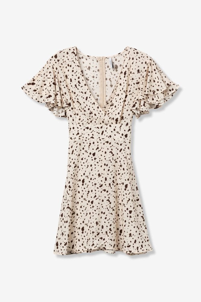 Vestido beige con estampado de manchas marrones, corte regular y mangas cortas con vuelo.