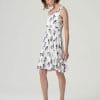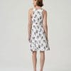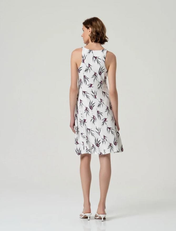 Vestido corto sin mangas con escote redondo y tirantes con detalle retorcido. Cuerpo ajustado y falda con ligero vuelo. Estampado y largo por encima de la rodilla.