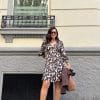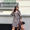 Vestido corto estampado marrón de manga larga. Escote en pico y abotonado. Engomado en la parte de la espalda.