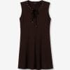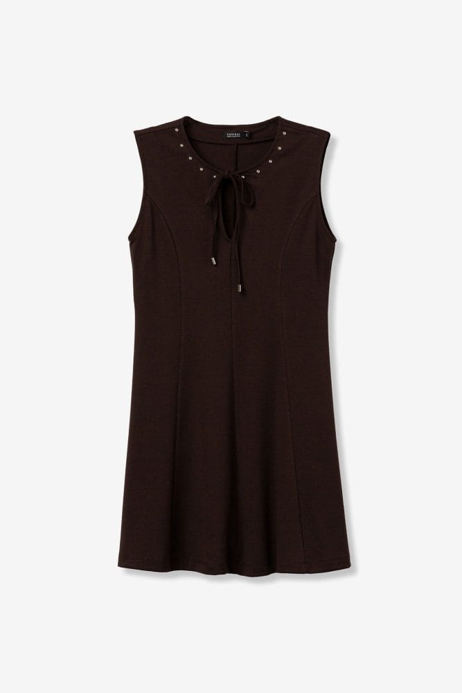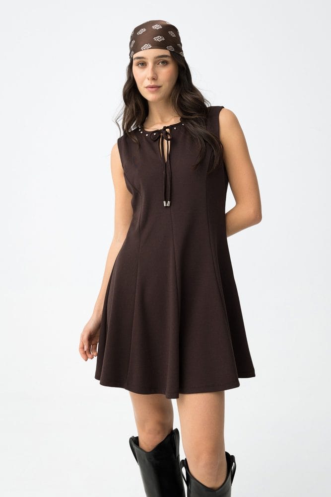Vestido corto de color chocolate, corte regular, sin mangas, escote con lazo y falda amplia.