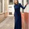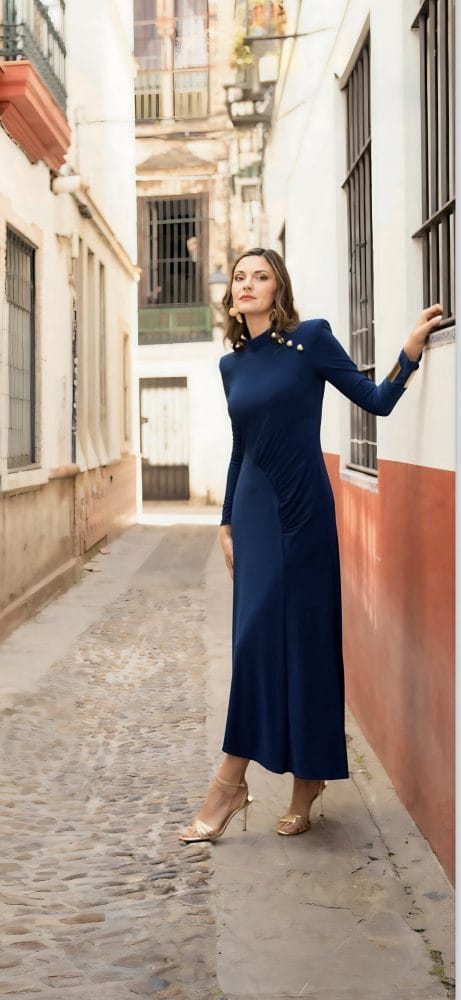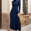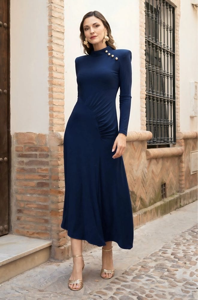 Vestido largo de punto marino con fruncido en la cintura. Escote cerrado, manga larga y botones dorados en la zona de la clavícula.