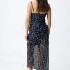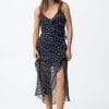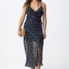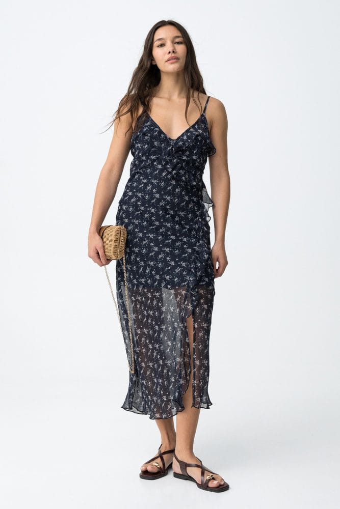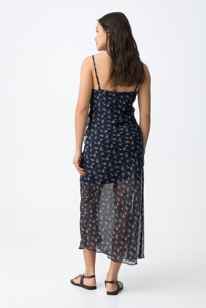 Vestido azul oscuro, corte slim, tirantes finos y estampado floral pequeño, con abertura lateral.