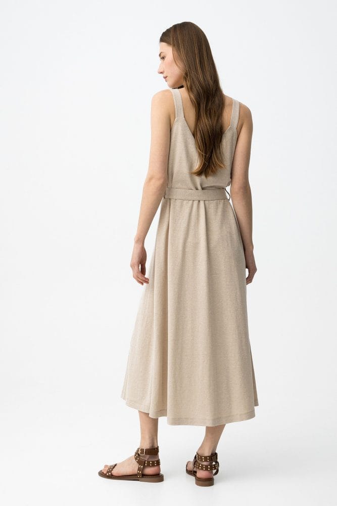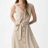 Vestido beige sin mangas, con botones delanteros y cinturón ajustable, corte regular y fluido.