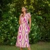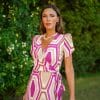 Vestido midi estampado. Mangas cortas tulipán, escote en pico cruzado. Con forro, cinturón y cremallera lateral.