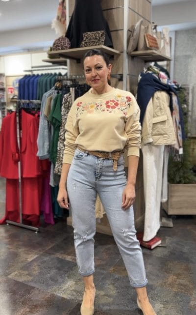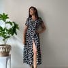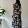 Vestido midi negro con estampado de margaritas, cierre cruzado con lazada. Abertura lateral.