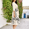 Vestido midi beige con estampado en tonos negros y arena. Cruzado con escote en pico. Abertura lateral en pierna. Cierre con cremallera trasera. Manga tres cuartos.