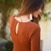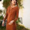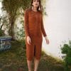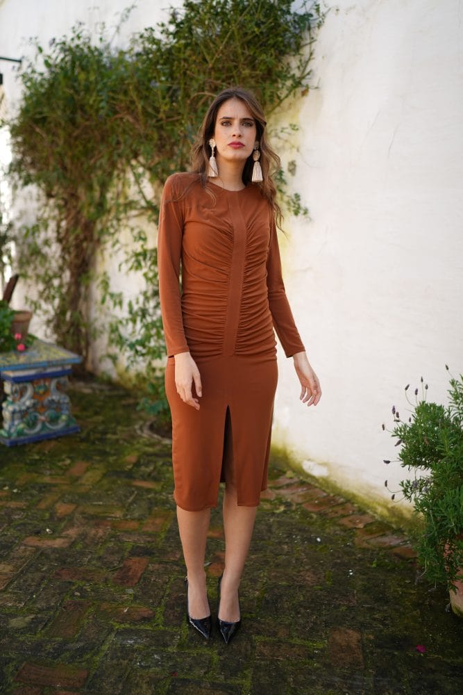 Vestido midi con fruncido en cuerpo. Manga larga. Abertura central.