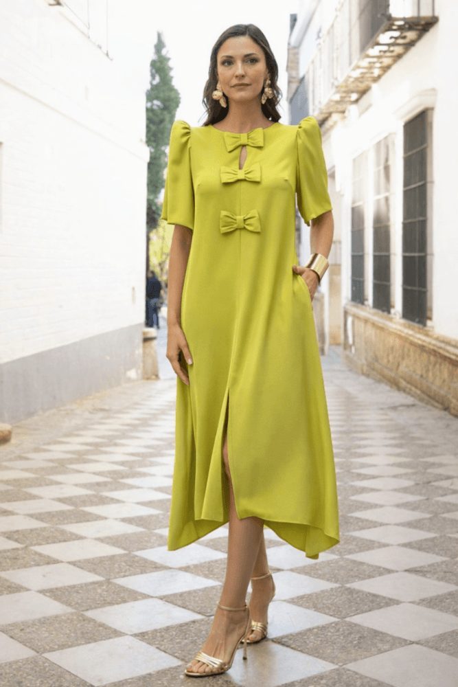Vestido amplio midi color verde lima con tres moñas en el pecho. Manga tres cuartos con hombros abullonados.