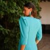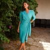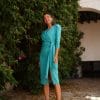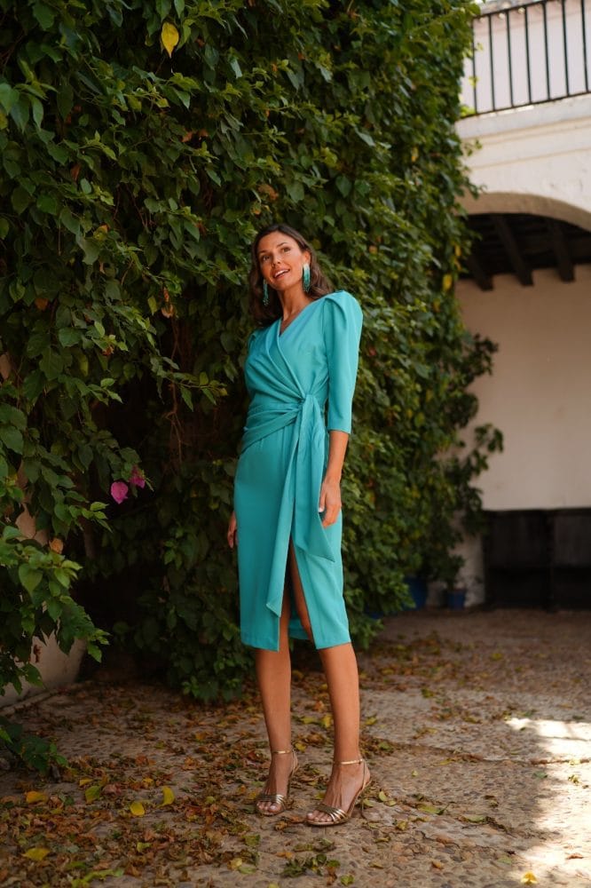 Vestido midi color turquesa cruzado con nudo. Abertura lateral en pierna. Manga tres cuartos y cierre con cremallera en espalda.