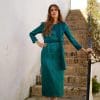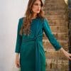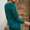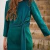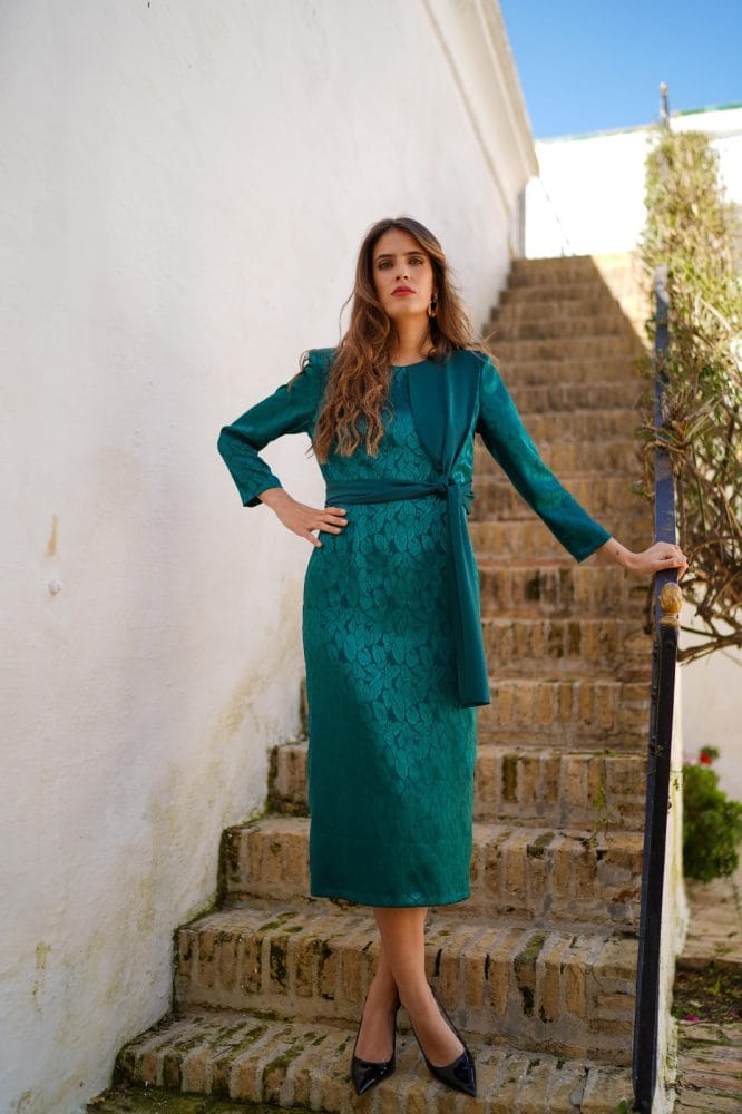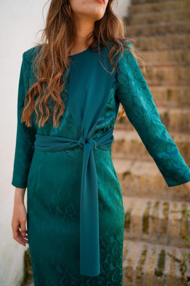 Vestido midi con cuello redondo y manga semi. Confeccionado en raso brocado y lazada de gasa, todo en color verde botella. Espalda con cierre de cremallera.
