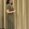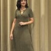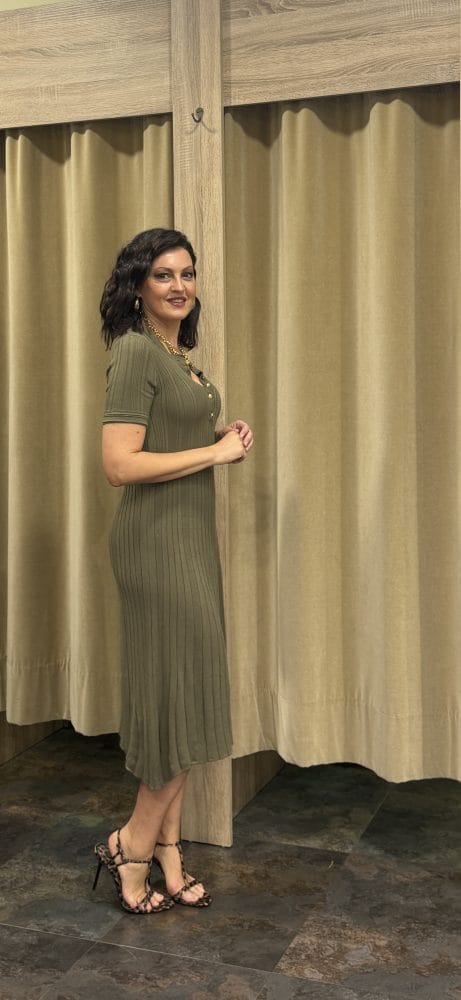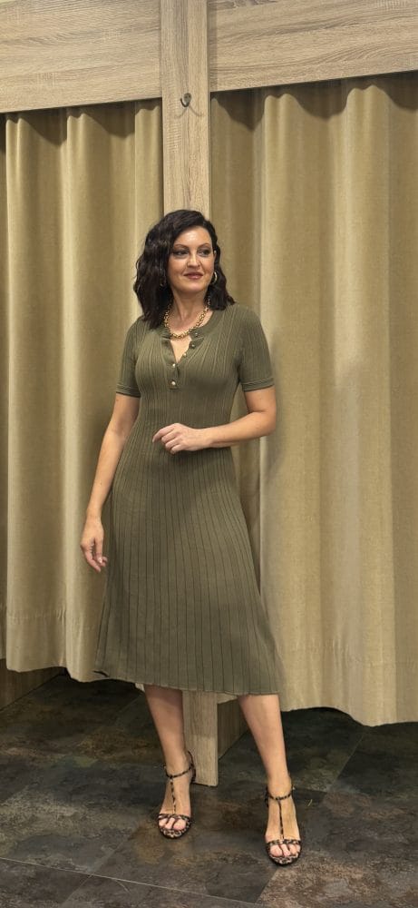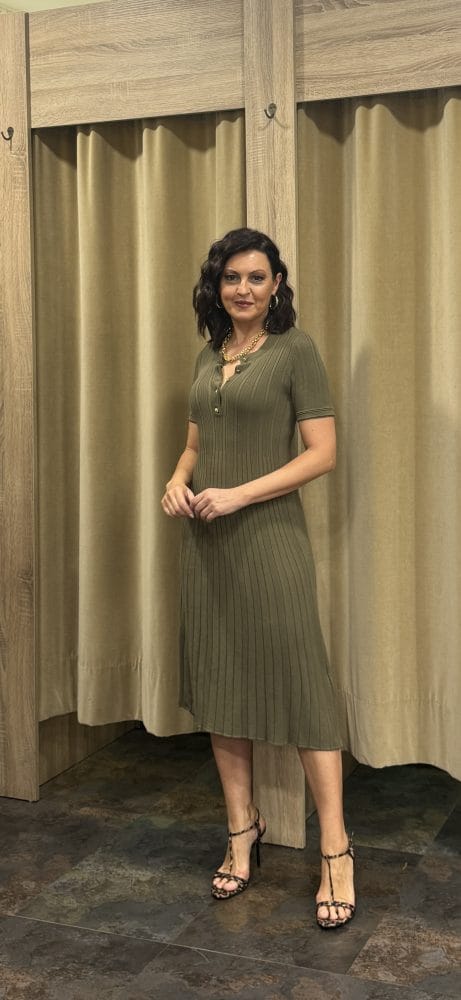 Vestido midi de punto canalé en color kaki. Manga tres cuartos y cuello redondo con botones.