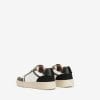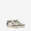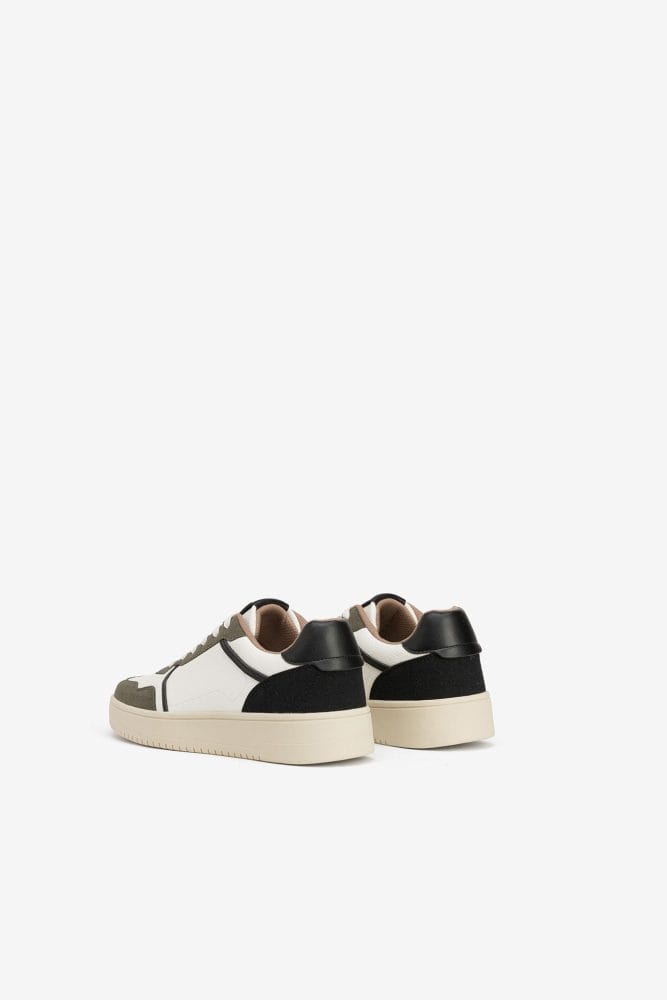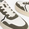 Zapatillas de diseño casual en blanco y verde oliva, con suela gruesa y detalles en negro.